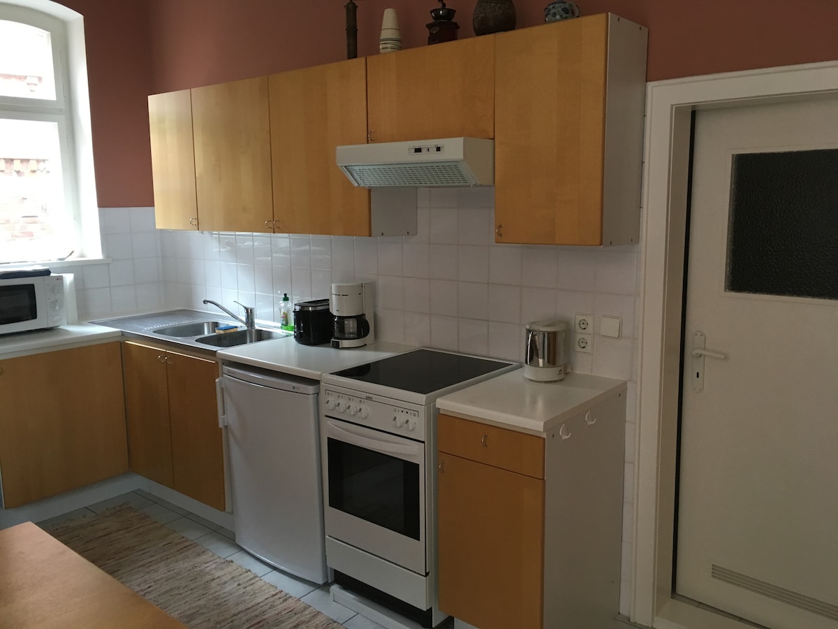 Koselig leilighet (ca. 75 eller 90 m²) i et vernet bindingsverkshus. Romslig, fullt utstyrt kjøkken med flislagt komfyr, stue med sovesofa, lesehjørne og flislagt komfyr, ett soverom (1-2 personer) eller to soverom (fra tre personer), hvert med dobbeltseng, bad med dusj og badstue. Trådløst nettverk i hele leiligheten med gratis internettilgang. Sentralvarme i alle rom. Privat hage. Tilgjengelig mot en ekstra kostnad: Transport fraBhf, shoppingservice,utleiesykler, kano,treningsstudio