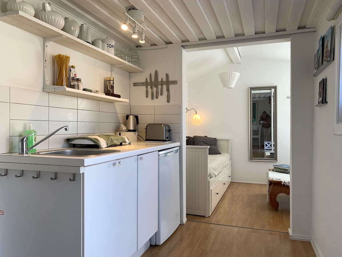 Føl deg som hjemme i et varmt og hjemmekoselig studio i frodige omgivelser, bare en steinkast fra Stockholms indre by. Med noen få meter til vannet kan du nyte utsikten over innsjøen, ro ut med kanoen eller snøre deg isen når isen legger seg. Det er mulighet for å låne både kano, sup, pulser og spark. Denne eiendommen er nyrenovert og lover en høy hyggefaktor med sine kjedelige farger og levende materielle valg. 2 store senger, King + Queen, Gratis parkering Til byen 15 minutter med bil. 35 minutter med tog