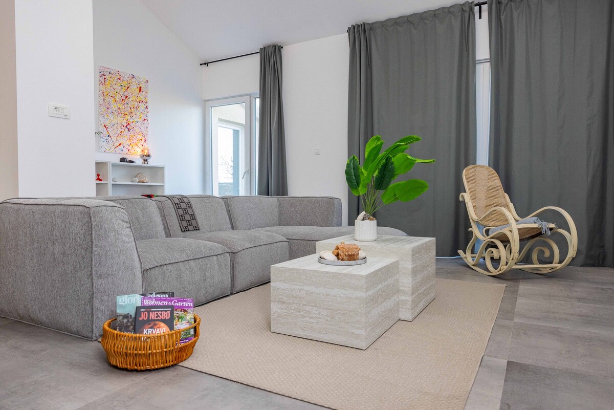 Denne renoverte to-romsleiligheten i Hvar tilbyr ro og bekvemmelighet, bare 15 minutters gange fra sentrum. Store vinduer gir en fantastisk utsikt over havet og naturlig lys, mens den moderne designen har en åpen stue og en privat terrasse. Hvert soverom med eget bad er designet for avslapning, noe som gjør denne leiligheten til en perfekt blanding av luksus og Hvars sjarm.