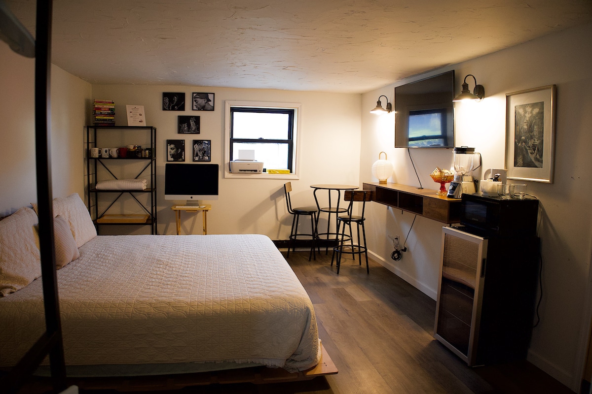 Det moderne tømmerhuset vårt er utstyrt med fine ting som tyrkiske håndklær, lokale håndverksåper og de mykeste lakenene. Den smakfulle innredningen har en mcm-stemning med industrielle detaljer. Vandre utendørs, svøm, følg en bekk, gå inn i skogen, gå tilbake, lag middag i et toppmoderne kjøkken med et spiskammer fullt av morsomme dingser. Slapp av ved peisen, sitt ute og se på stjernene, tenn en brann. Vi tilbyr tepper og ved. En velkomstkurv og en fullt utstyrt kaffebar for de tidlige morgenene venter på deg.