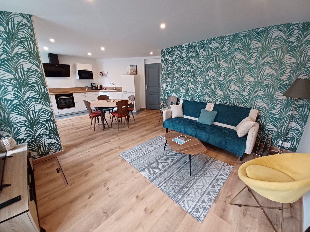Spis frokost, les, betrakt havet 🌊 fra stuen i denne koselige leiligheten med balkong på Opalkysten med innsjekking uten vert. ✅ Høydepunkter 🌅 180° havutsikt 🪟 Stort buktvindu og 6 kvm balkong. 🚗 Privat garasje (én plass) 📶Trådløst nettverk + tilkoblet TV ✨Renovert leilighet på 54 kvm, koselig og lys, med en raffinert innredning. 🏖️Alt innenfor gangavstand: strand, butikker, restauranter, kasino … og gå for å observere selene (avhengig av tidevannet). 👶 Babyer er velkomne: sammenleggbar barneseng og barnestol på stedet