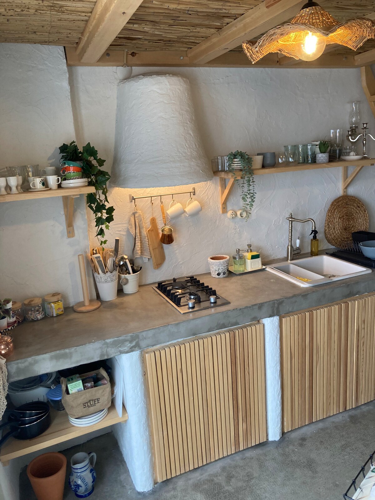 Hei, først og fremst er dette leirhus laget av leire i de tradisjonelle steinmurermetodene fra det gamle Middelhavet. Vi lever et selvforsynt liv «så godt vi kan», så strømmen vår kommer fra solenergipaneler som er nok til å drive et lite kjøleskap, bærbare datamaskiner, lys og telefonladere. Vedfyringsvannvarmer på badet. Vi ønsket å være langt fra folkemengdene, så det er ikke så lett å komme seg til oss. Så det er best hvis du har en 4x4, eller du kan gå oppover en sti i 15 minutter.