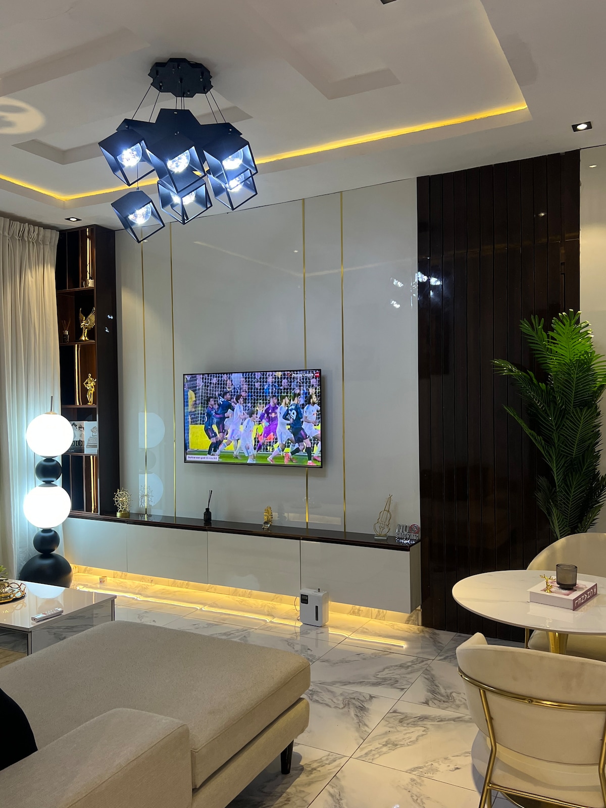 Flykt til Olumides rolige oase i hjertet av byen! Vår luksuriøse tre-roms leilighet med 33Kva transformator garanterer uavbrutt strømforsyning. Slapp av med stil med våre myke king-size og to queen-size retreats, hver med eget bad, for ultimat komfort. Hold kontakten med raskt trådløst nettverk, støttet av en reservegenerator, og Netflix med våre 65- og 42-tommers smart-TV-er, fullt utstyrt kjøkken og private balkonger. Perfekt for langvarige opphold, familier og grupper. Bestill nå og slapp av med stil