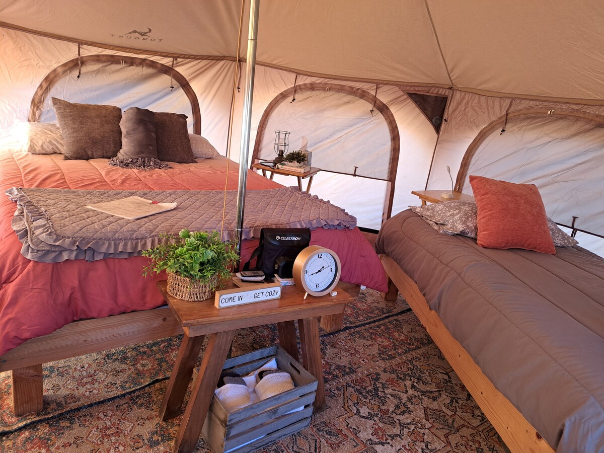 Stay at The Embers Glamping and RV Resort, in one of our cozy bell tents! Our bell tents are heated and air-conditioned, so you can camp comfortably! Each features a king bed, single sleeper futon, coffee maker, mini fridge, picnic table and firepit. Our bath house with private bathroom suites is located nearby. All linens are included -just pack your bags and come ready to relax! As a guest here at The Embers, you'll have access to all the resort amenities! *POOL IS CLOSED FOR WINTER SEASON