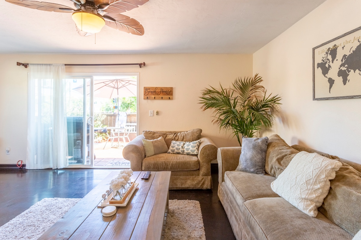 I hjertet av Pacific Beach, et vakkert nyoppusset lyst og luftig hjem med to soverom/to bad, privat hage og boblebad under blinkende lys. Gå til det beste PB har å tilby: restauranter, barer, yoga, kaffe. Strand/bukt mindre enn 1,6 km unna. Parkering i garasje for én bil. Etter en dag på stranden, kom hjem for å nyte bålet, jacuzzien, spille et spill corn hole, eller se en film innendørs på den koselige store sofaen. Alltid fullt utstyrt kaffebar med førsteklasses kaffe.