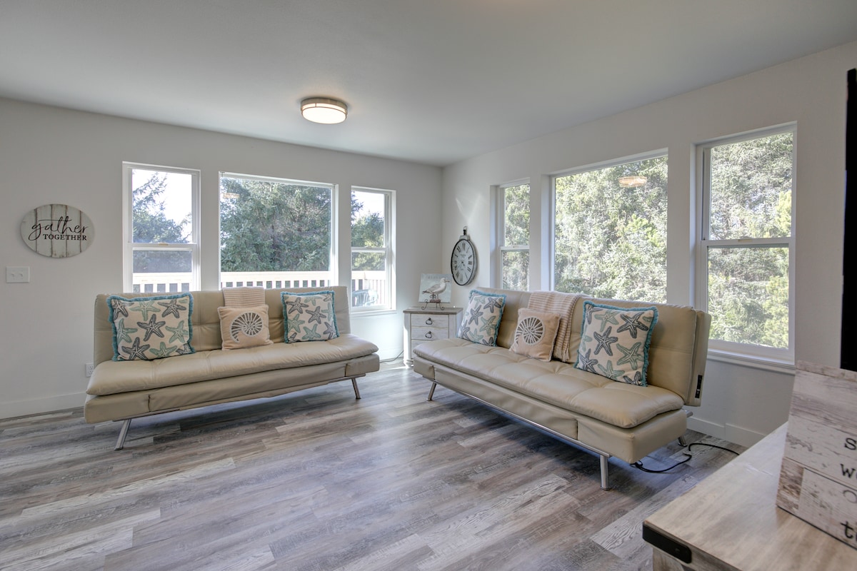 Slapp av på Riptide Retreat med havutsikt og nyd vakre solnedganger! Ligger på to private hektar mellom Ocean Shores og Seabrook. Sesongbasert strandsti for turgåing (kun sommer/høst). Alle sykler/motoriserte kjøretøy er strengt forbudt på stien og sanddynene. To minutters kjøring til offentlig strandinngang. Nyt et fullt utstyrt kjøkken, inngjerdet hage for hunder, propangrill, stor terrasse, hvilestoler, elektrisk peis, smart-TV-er, Keurig, to lekegrinder, vaskerom, strandleker og mer. Garasjen har plass til to små biler.