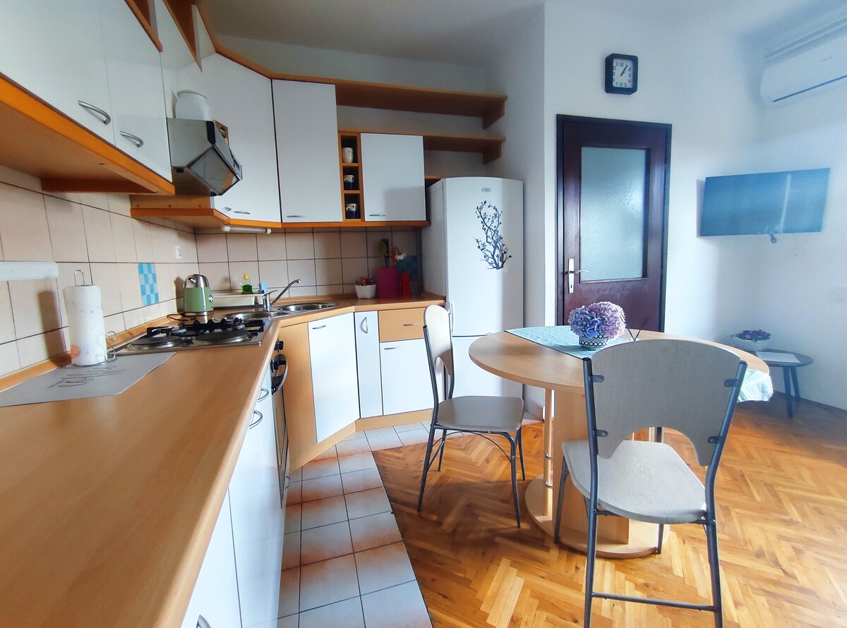 En leilighet i middelhavsstil i første etasje, en romslig terrasse og en hage bare et par meter fra havet. Det er en privat terrasse foran huset. Et sjarmerende kjøkken er godt utstyrt for et avslappende opphold. Leiligheten har to soverom med dobbeltseng, slik at den kan tilby overnatting for fire personer. Gjestene våre kan bruke en SUP til å forelske seg i fantastiske Šimuni. En vakker strand med barer og mye skygge fra furutrær ligger ett minutts gange unna, og en lokal butikk ligger tre minutters gange unna.
