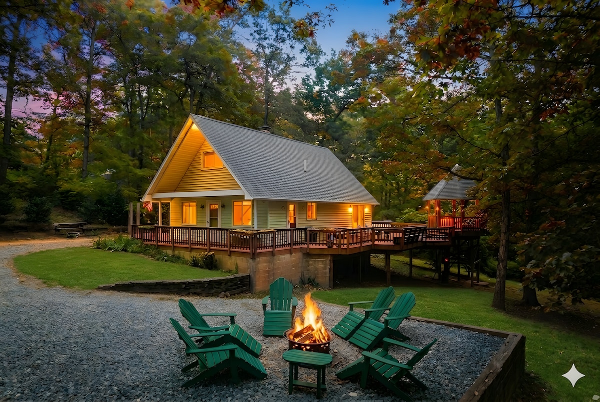 Naturmorgener, knitrende bål og stjernehimmel. En fredelig base for eventyr. Denne perlen tilbyr: – Privat boblebad omgitt av fredelige trær. - grill. - avsidesliggende hytte – Koselig bålpanne med Adirondack-stoler, perfekt for å dele historier – fullt utstyrt kjøkken + kullgrill utendørs for hjemmelaget mat – Nipp til kaffe på terrassen med frisk luft og fuglesang. – Perfekt for par, små grupper eller alle som søker ro. Reserver feriestedet ditt i dag – denne perlen blir raskt bestilt!