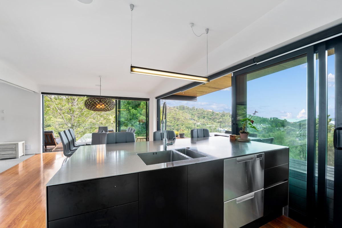 Dette nybygde, arkitektoniske hjemmet er et moderne hus i tre etasjer med en utrolig forbindelse til Opua-skogen. Åpne de doble dørene og ta en dyp pust av den forfriskende skogsluften og ta inn de beroligende nyansene av grønt. Med Bay of Islands rett utenfor døren, vil dette huset gi deg alt du trenger for å komme tilbake og hvile og komme deg etter en dag med å utforske strendene, vingårdene, øyene, buskturene, fisketuren og mye mer denne utrolige beliggenheten har å tilby.