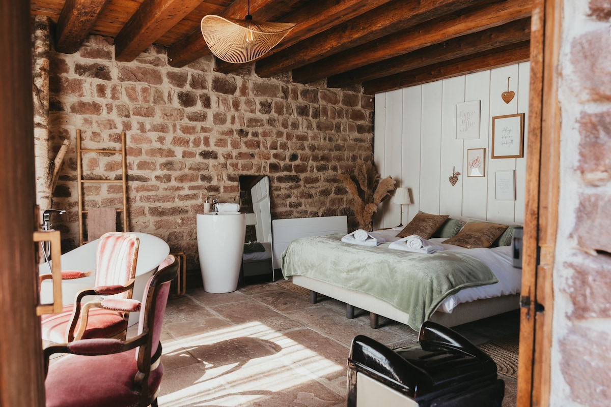 Gjestehus i hagen (ikke en hytte, derfor ikke noe kjøkken) Med bad: dusj, toalett, vask, oppvarming/klimaanlegg Frokost inkludert En oase av fred og ro i en grønn oase i hjertet av en eksepsjonell hage Middag (kun på forespørsel) Denne boligen er laget for en eller to personer Kjæledyr ikke tillatt Hage Medlem av Alsaces parker og hager og parker og hager i Frankrike Medlem av foreningen for europeiske japanske hager