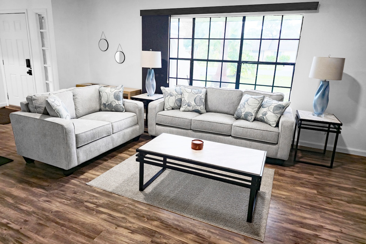 Welcome to our stylish Palm Bay retreat! This modern, spacious home is designed for comfort and relaxation, featuring upscale amenities and a prime location for your Florida getaway. Enjoy a fully equipped kitchen, vibrant décor, and cozy living spaces. Unwind in our living space or outdoor seating areas, by the Pool perfect for making lasting memories. Please note: Indoor black swings are decorative; outdoor swings are for use. Book your stay and experience the charm of this beautiful home!