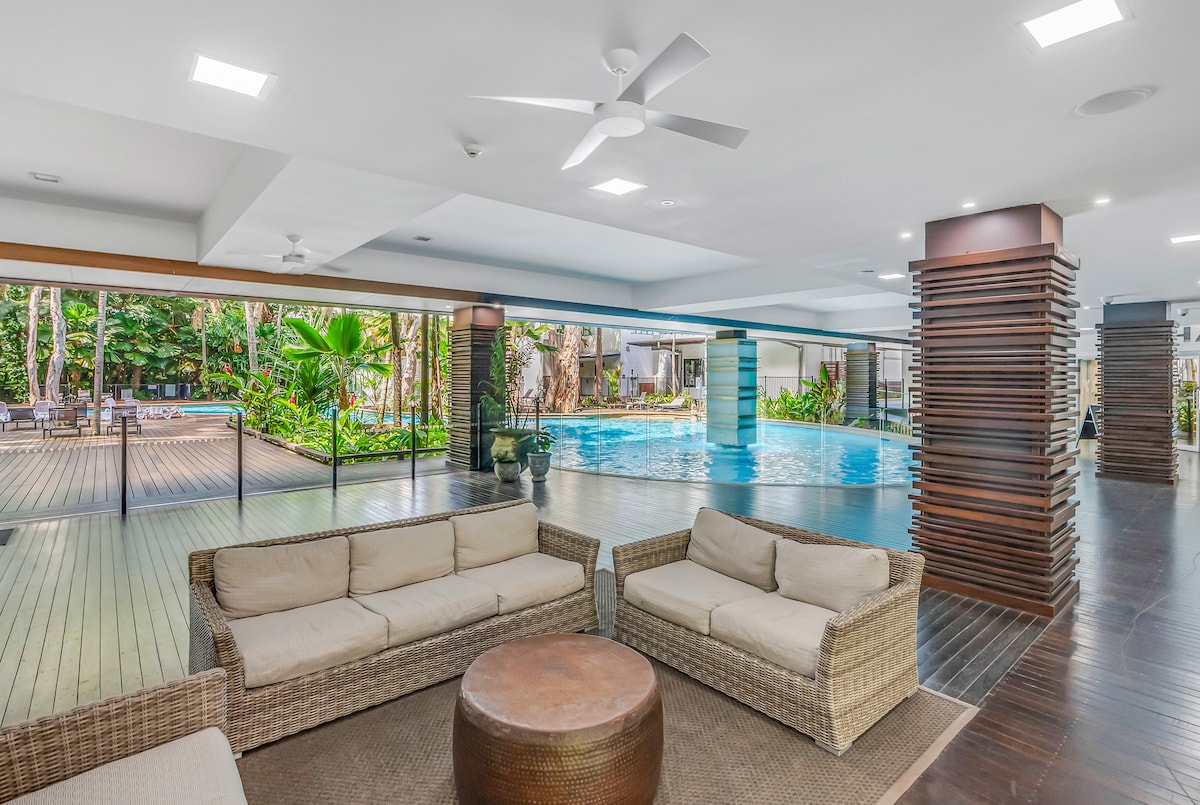 Leiligheten min i første etasje har utsikt over det enorme trekledde bassenget på feriestedet «Drift», og er kanskje den mest ettertraktede i komplekset. Resortet ligger over veien fra stranden ved Palm Cove og er omgitt av kafeer og restauranter, og har enkel tilgang til golfbaner, nærliggende eventyrsport og det ikoniske Great Barrier Reef & Daintree Rainforest. Palm Cove ligger på en 4 km lang sandkystlinje 20 minutter nord for Cairns CBD og flyplass.