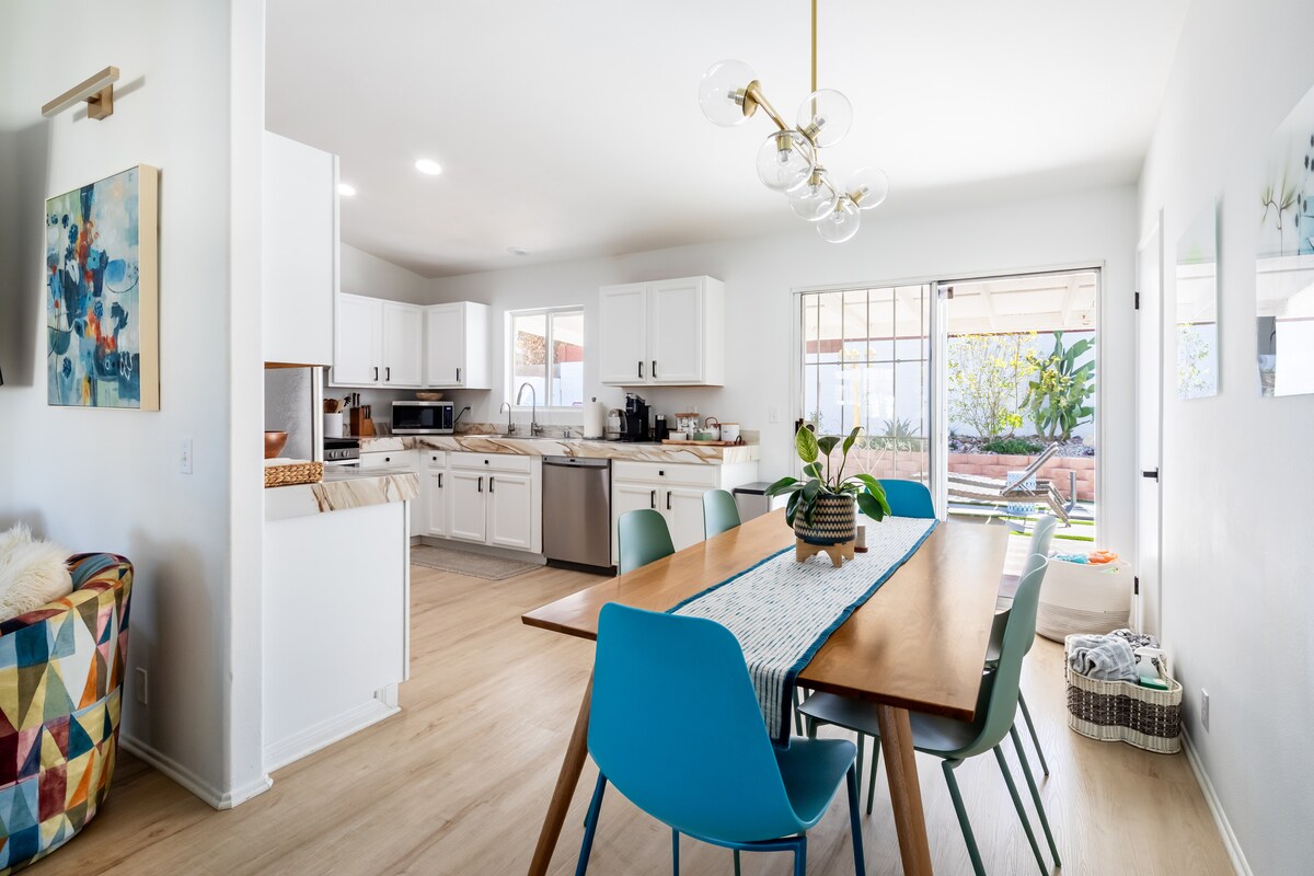 Remodeled, modern, walking distance to El Paseo! Our home is the perfect place to recharge and enjoy everything the desert has to offer! Featuring 2 bedrooms, one with 2 XL twin beds that can convert to a Cal King instead! 2 baths, high-speed internet, Free Level 2 EV Charging, pool and jacuzzi, fully equipped kitchen, new appliances, fire pit and loads of space for indoor/outdoor enjoyment. Located within walking distance of El Paseo, exquisite dining, shopping and even The Living Desert zoo!