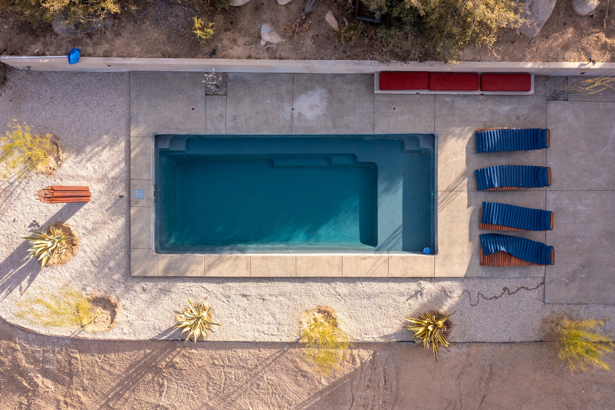 Er du utbrent og trenger en omstart? Casa Coyote er et privat velværeretreat i Joshua Tree med boblebad, badstue, kaldt basseng og cowboybasseng under mørk ørkenhimmel. Fullt inngjerdet for kjæledyr. King size-senger + queensize-senger, peis, yogarom og nivå 2 elbillader (universalplugg + Tesla-adapter). Bare noen minutter til byen, men likevel verdener unna. Våkn opp med soloppgangen, beveg kroppen din, slapp av under stjernene og dra med en klar, jordet og fullt oppladet følelse.
