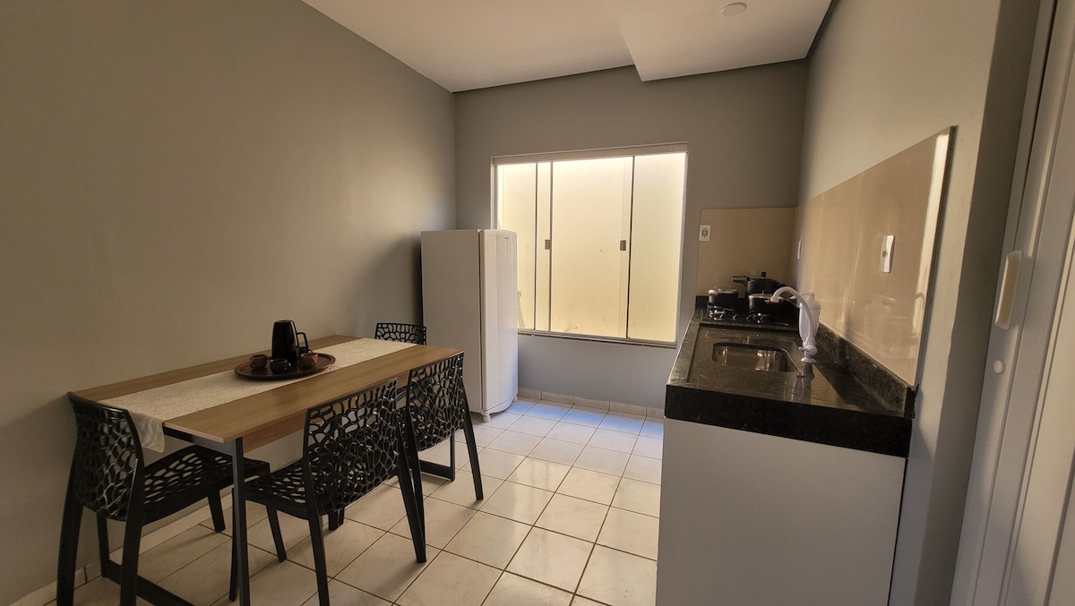 Micro Casa com garagem Local tranquilo, ideal para casais ou viajantes que buscam um espaço funcional e bem equipado. O ambiente conta com cama de casal, ar-condicionado e Wi-Fi. A cozinha é completa, equipada com geladeira, fogão e utensílios, permitindo preparar refeições com facilidade. Há também mesa com cadeiras, para refeições ou trabalho remoto. O banheiro é privativo, trazendo mais comodidade durante sua estada. Área comum compartilhada com mais duas unidades. Vaga de garagem.