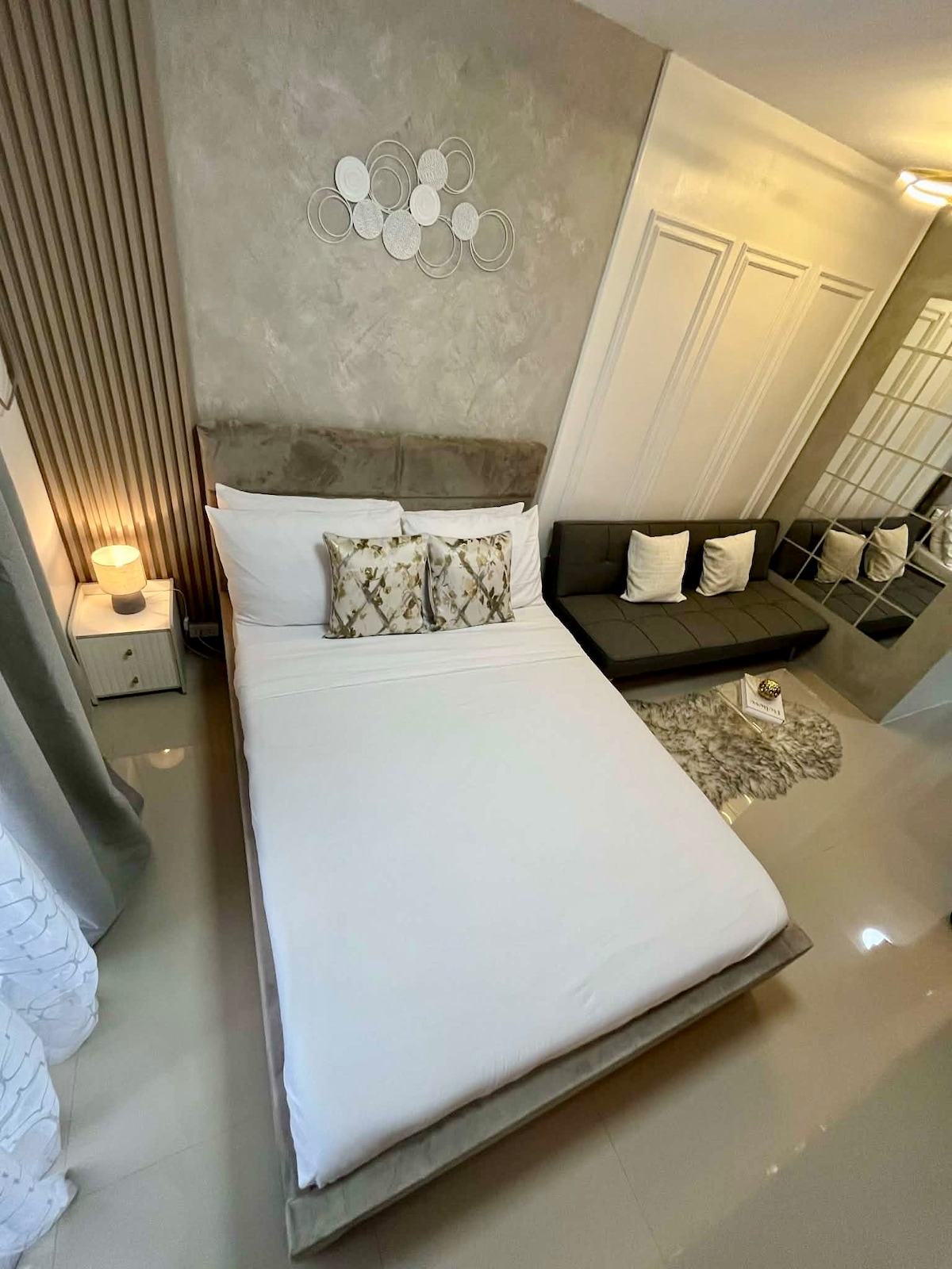 Spacious Fully furnished condo design perfect for family and staycation. Includes home furniture (sofa, Smart tv with Netflix, cable TV and fast internet, 6-seater dining table), full kitchen (rice cooker, induction cooker, range hood, electric water heater, dining sets and utensils, pots pans). 2 air conditions, Beds (king Size, Double, Single pull out bed). T&B (bidet, hot and cold). Drying cubicle for laundry on Roof top. Amenities: Pool, gym, billiards, play house for kids and a clubhouse.