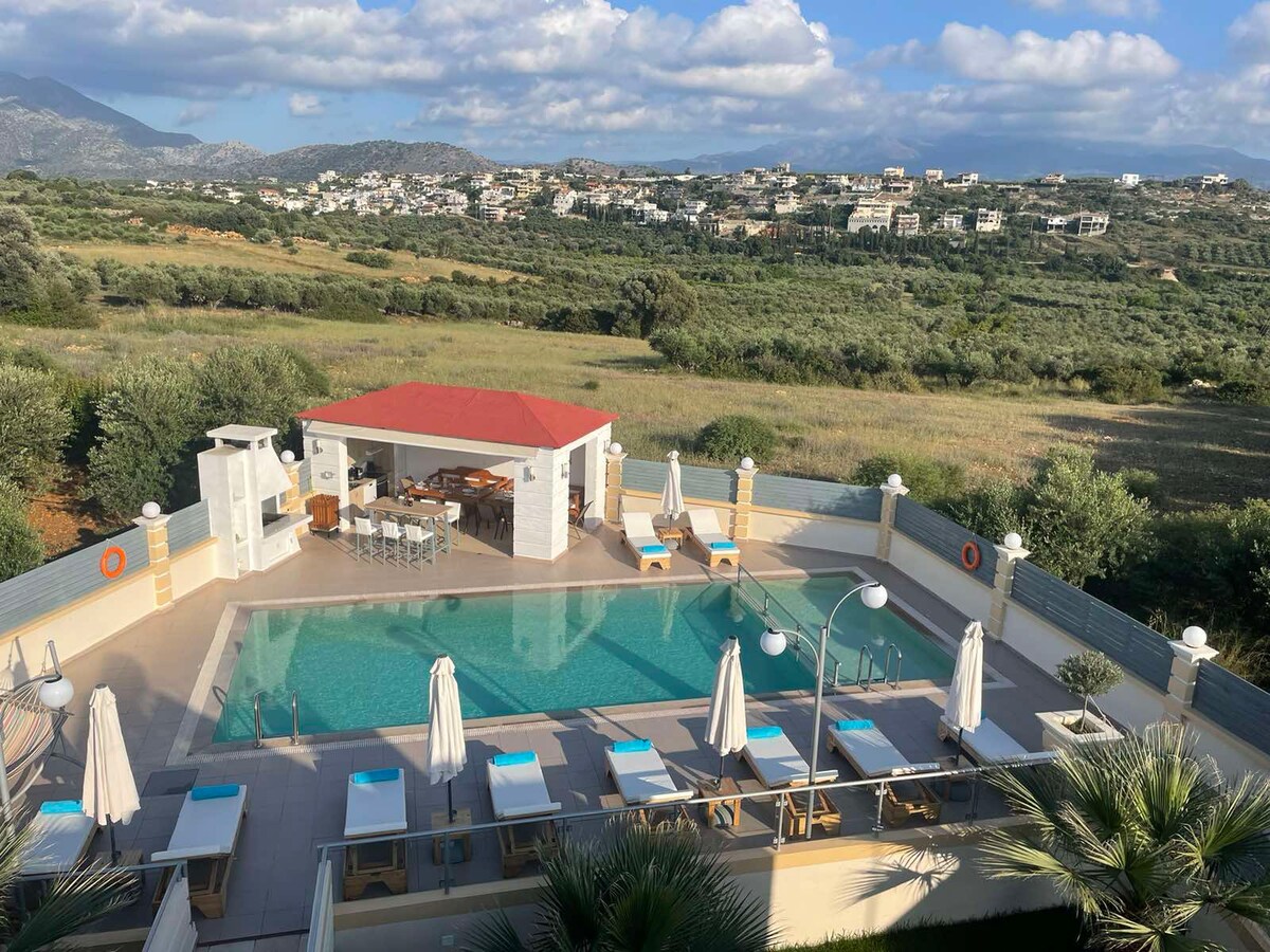 Villa Nefeli er en luksuriøs villa med syv soverom og fem bad, og den har plass til maksimalt 18 gjester. Villaen har et 60 kvm privat svømmebasseng (dybden varierer fra 1,40 til 1,85), og har også et spesielt barnebassengrom (0,60–0,70 meter dypt). Villaen har to griller (trekull) og en tradisjonell treovn som gir gjestene våre muligheten til å smake ekte kretisk mat. For din ytterste bekvemmelighet er det også et utekjøkken. Innendørsarealet er på 280 kvm, og uteområdet er på 2000 kvm.