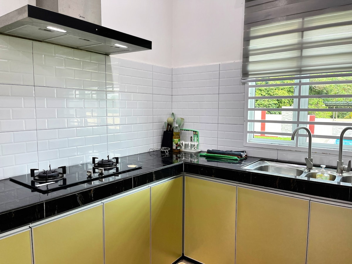 Koselig ✨ hjemmeopphold i Taman Idaman Jaya Pantai Pengkalan balak ✨ 🏡 Tre rom, to bad (to rom har bad). 🛏️Hvert rom har én queensize-seng. 🛋️Romslig stue ❄️Klimaanlegg per rom og stue. 🍳Fullt utstyrt kjøkken, vaskemaskin er tilgjengelig! Matlaging og grill 🥘 tillatt 🏊 Badebasseng for barn 🛝 Mot en lekeplass. ⛱️ Tre til fem minutter til Log Base Beach. Enkel og trygg 🚗parkering 🫂 Passer for små familier og middels budsjett