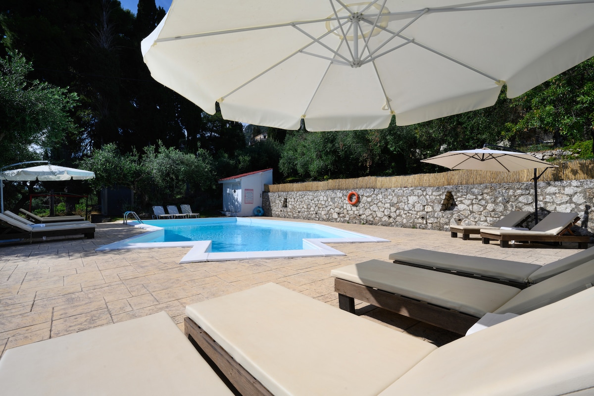 Fem rolige familiedrevne leiligheter/studioer på et ideelt sted.Omgitt av oliventrær og fjellutsikt.Med et generøst svømmebasseng,en lekeplass for barn og et avslappende bbq-område..Gangsti til den nærliggende lokale kirken St. Fredag og enkel tilgang til sentrum av landsbyen Benitses (800 m) hvor det er mange restauranter/kafébarer og butikker.Beliggende på den sørlige delen av øya 12 klm fra Korfu by/flyplass innen rekkevidde av de vakreste sandstrendene.