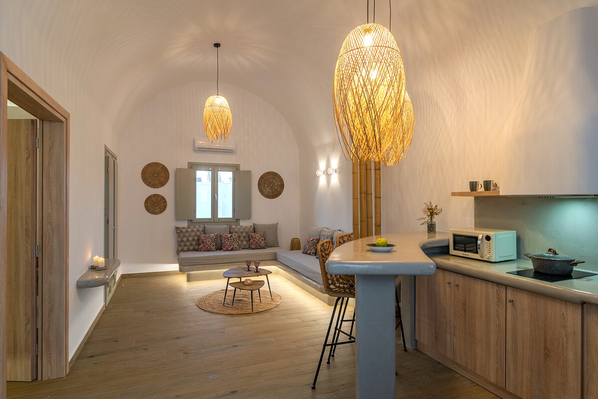 Bluedome-suiten er et renovert tradisjonelt grottehus som er ideelt for par og små familier. Det er bygget med den tradisjonelle kykladiske hulehusarkitekturen, skåret i den vulkanske kalderaklippen. De minimalt designede stedene inviterer til avslapning og komfort. Hovedsoverommet (med eget bad) er på baksiden av grotten som er forbundet med stuen og sitteplassen, kjøkkenet og det andre komplette badet, med utsikt over terrassen og det spesialbygde boblebadet.