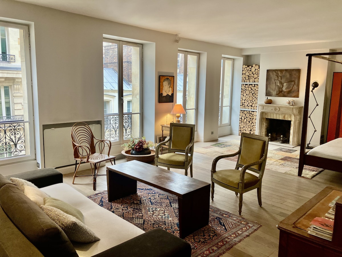 Denne sofistikerte 110 kvm leiligheten har parkettgulv i sildebein, fine møbler og rikelig med naturlig lys, og tilbyr en lys, elegant, varm og luksuriøs atmosfære. Leiligheten, med peis og lister, som kombinerer sjarm, ro og komfort, ligger i en av de eldste passasjene i det historiske sentrum av Paris. Denne leiligheten har en offisiell lisens for turistovernatting. Så det er helt lovlig.