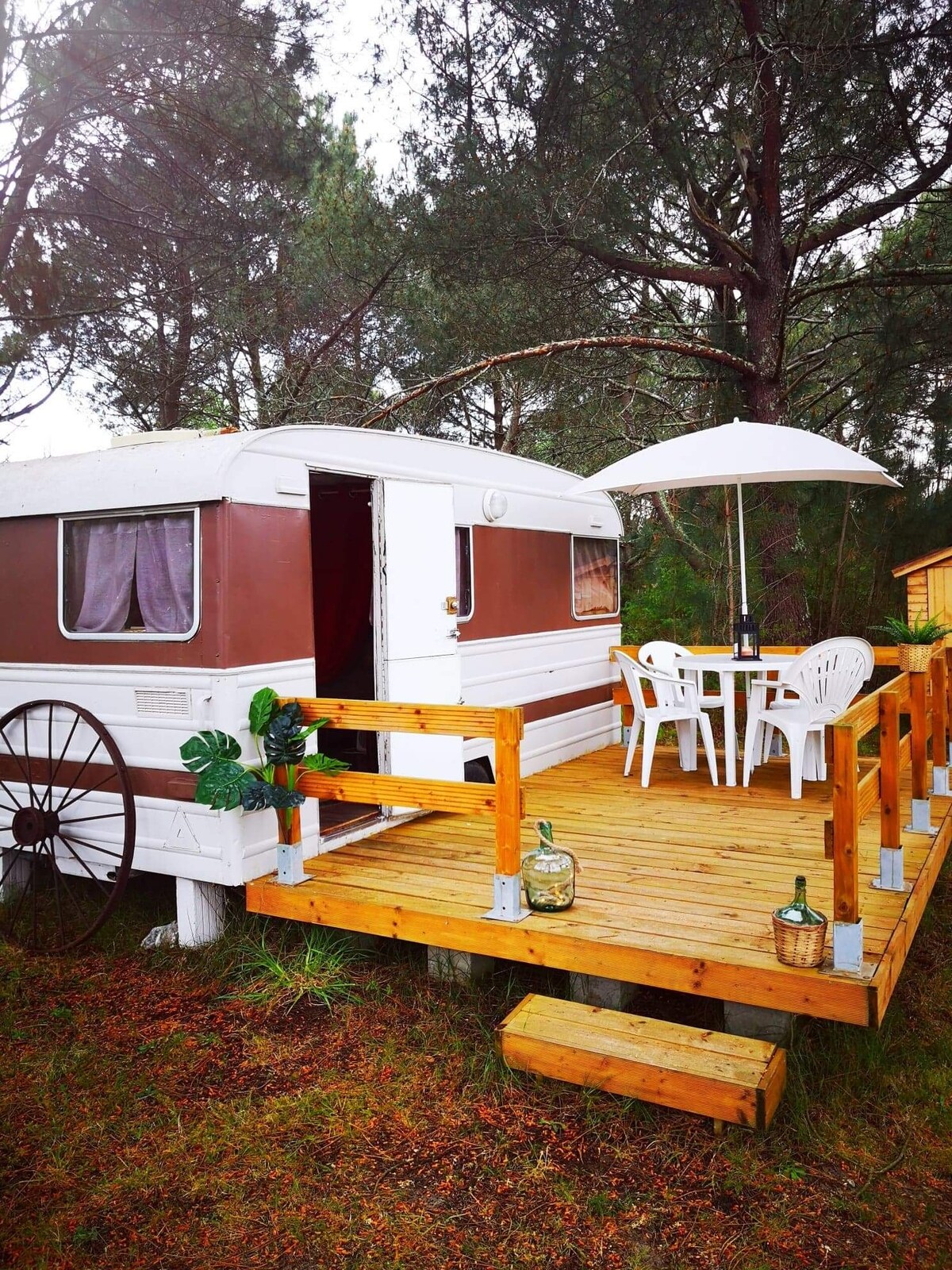 Romslig vintage campingvogn omgitt av en permakultur skoghage på 3000 m2: rustikk, men komfortabel! Natur, fred, stillhet råder her. Det er et eremitasje, et sted for ressurser: siden 1999 har vi investert mye omsorg og kjærlighet i stedet. Bare de som elsker natur og velvære vil sette pris på dette. Dette er ikke et hotellrom eller et palass. Sykkelstier i nærheten (3 min) Tilstøtende skog. Mimizan-sjøen 6 km unna Havet: 7 km. Sykling: 25 min.
