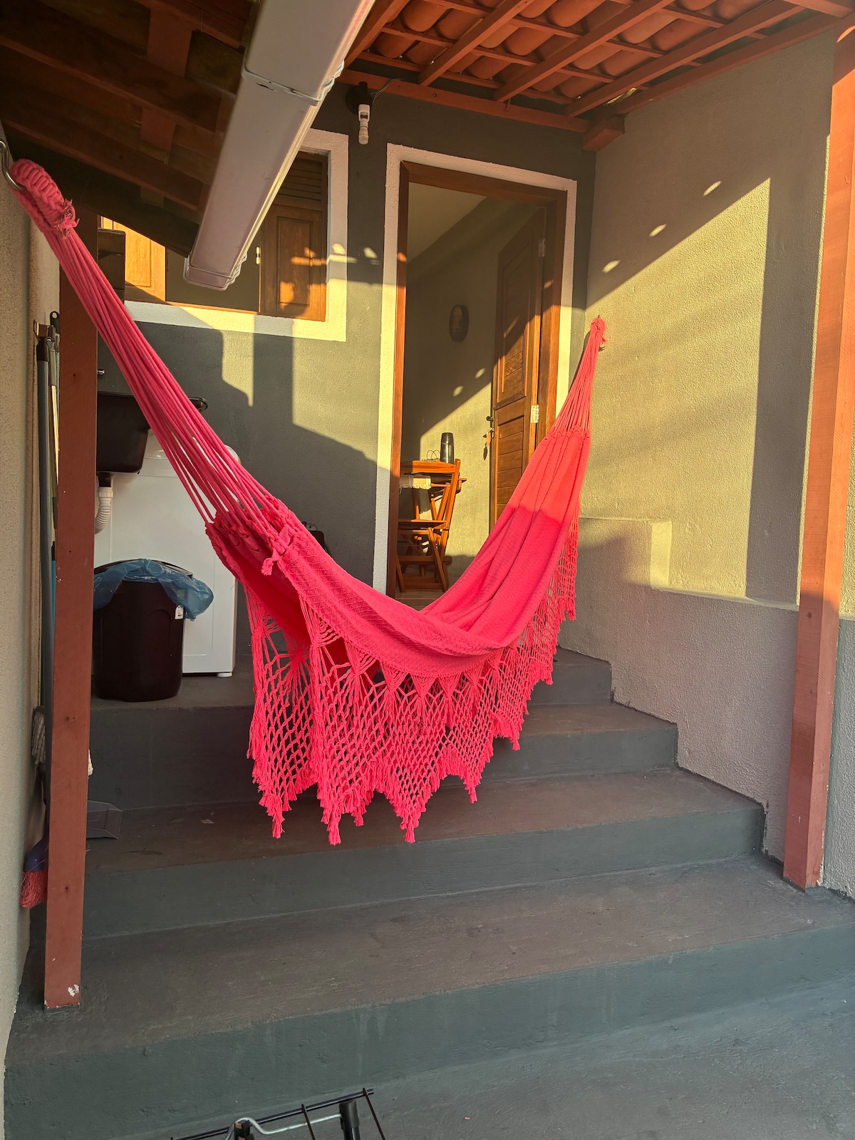 Hele huset med alt du trenger for et hyggelig opphold, beliggende i en svært praktisk del av byen. Boligen har en stue med TV, kjøkkenområde med mikrobølgeovn, bestikk, luftkoker, elektrisk kaffemaskin, elektrisk komfyr, minibar, Wi-Fi, bad og en flott hengekøye for hvile. Soverom med dobbeltseng og aircondition, ett soverom med to enkeltsenger og en hengekøye, hårføner og strykejern, garasje