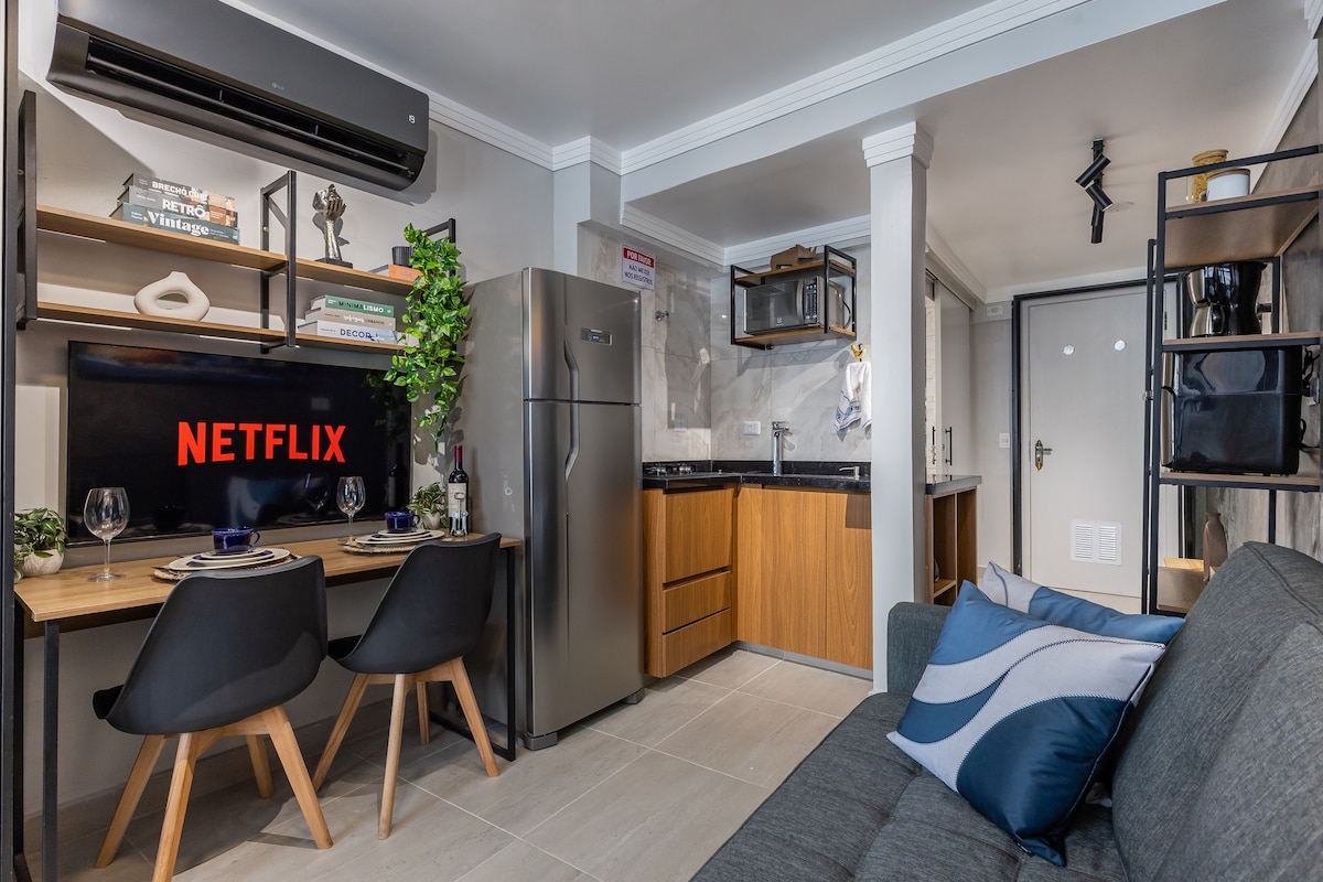 Studioleiligheten ligger i 31. etasje i den høyeste bygningen i sentrum, med et moderne og innbydende design, samt en imponerende utsikt over byen. Fra vinduet kan du beundre Anhangabaú-dalen, det historiske senteret, antennene til Av. Paulista: et av de vakreste landskapene i São Paulo. Det er bygningen der SampaSky ligger, og det er mulig å gå til hovedattraksjonene i sentrum. Den har klimaanlegg, 55"TV med apper, kjøkken utstyrt med grunnleggende redskaper, platetopp (1 munn), mikrobølgeovn og minibar.