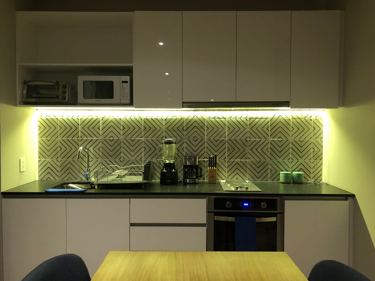 Moderne og komfortabel leilighet 8 minutter fra stranden, ADO bussterminal og fergen til Cozumel. Ideell for opptil 4 personer som ønsker ferie, helg eller lange opphold/hjemmekontor (100 MB internett i leiligheten). Bygningen har privat sikkerhet 24 timer i døgnet, takhage med basseng, treningsstudio og en sentral hage som tar pusten fra deg. Ligger foran Parque la Ceiba, to gater fra supermarkedet Chedraui, banker, apotek og hovedgatene.