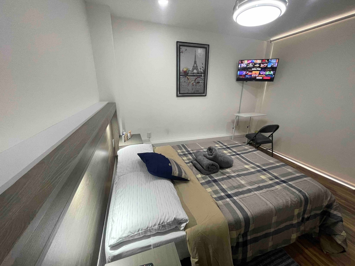Hotel type double room for leisure or business. Open black out curtains to let morning sunlight fill this modern space and prepare yourself a coffee or tea to start your day. Sleep in a comfy Queen bed, and relax in the sofa watching the smart TV with complementary Fast wifi / Private bathroom with all organic soap/shampoo and AC. Shared kitchenette and laundry Must submit to enter the property: - Number of guests - Must sign our internal agreement (house rules)