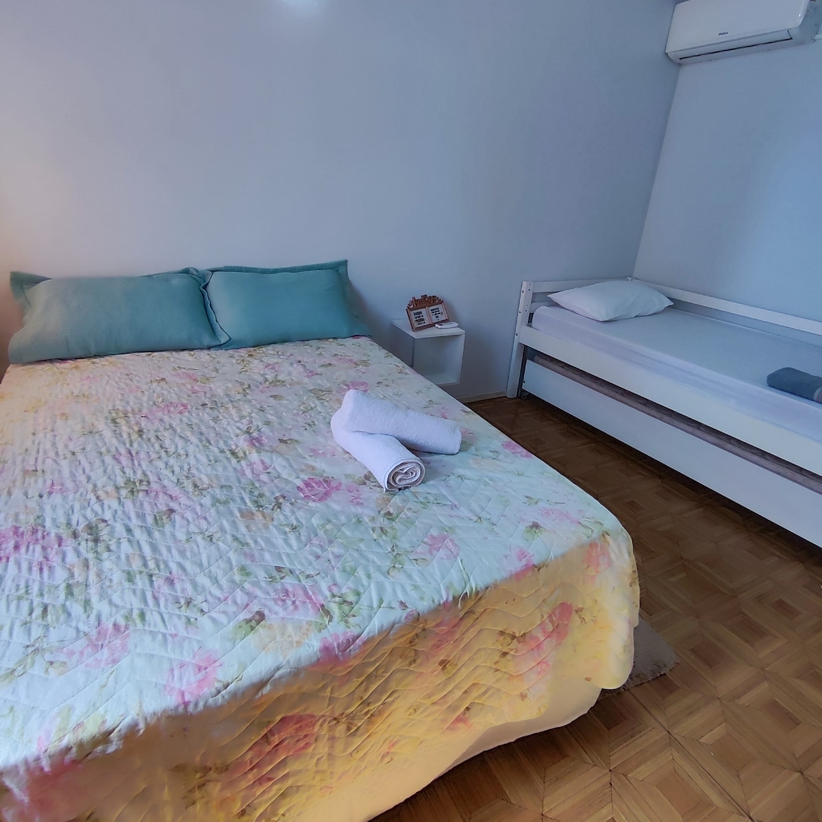Apto em prédio familiar, todo reformado sendo a porta de entrada c/ fechadura eletrônica com senha, móveis e utensílios domésticos novos, sofá retrátil, tv 32”, Wi-Fi 150 megas, ar condicionado nos 2 quartos, secador de cabelo, máquina de lavar roupa, microondas, cooktop, sanduicheira elétrica, ferro, tábua de passar roupa, 1 jg de lençol de casal e 2 de solteiro, 4 travesseiros, 1 cobertor de casal e 2 de solteiro, estacionamento para 1 veículo, portaria 24 horas.