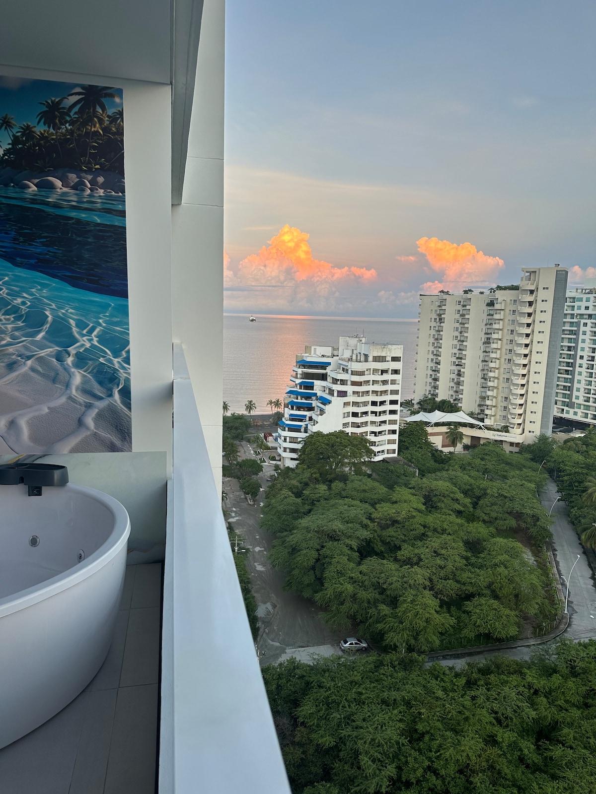 Relájate escapada única y tranquila con vista al mar y jacuzzi privado dentro del apartsuite de lujo, disfruta de un TV de 70 pulgadas y cocina equipada. Ubicado en un exclusivo condohotel en la zona turística d Santa Marta a tan solo 3 minutos a pie de la playa más hermosa de Bello Horizonte, ideal para parejas o 3 o 4 personas: Cama Queen colchón de lujo + cama auxiliar Queen. Limpieza diaria gratuita. Disfruta dentro de un hotel 5 estrellas y vive una experiencia inolvidable. Reserva ahora!