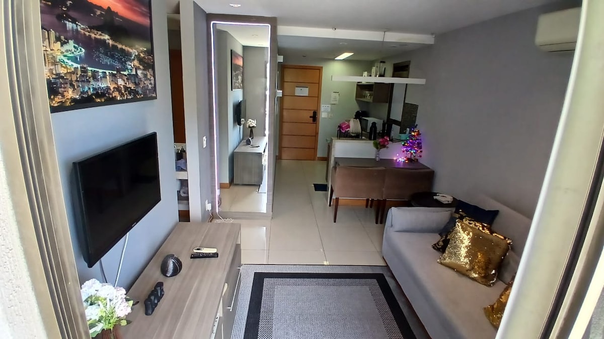 Den koselige leiligheten vår er forberedt med stor omsorg for å ta imot deg. Den er unik med sin egen stil og med all raffinementen til et feriested med spa, badstue, treningsstudio, restauranter. Vår takterrasse er koselig og med en vakker utsikt. Leiligheten vår ligger 1,3 km unna Hilton Barra RJ, ved siden av Centro Metropolitano. Perfekt for å bo for å gå på konserter eller arrangementer i den olympiske parken, det er 10 minutter å gå til arenaene og 10 minutter med bil til Barra-strendene.