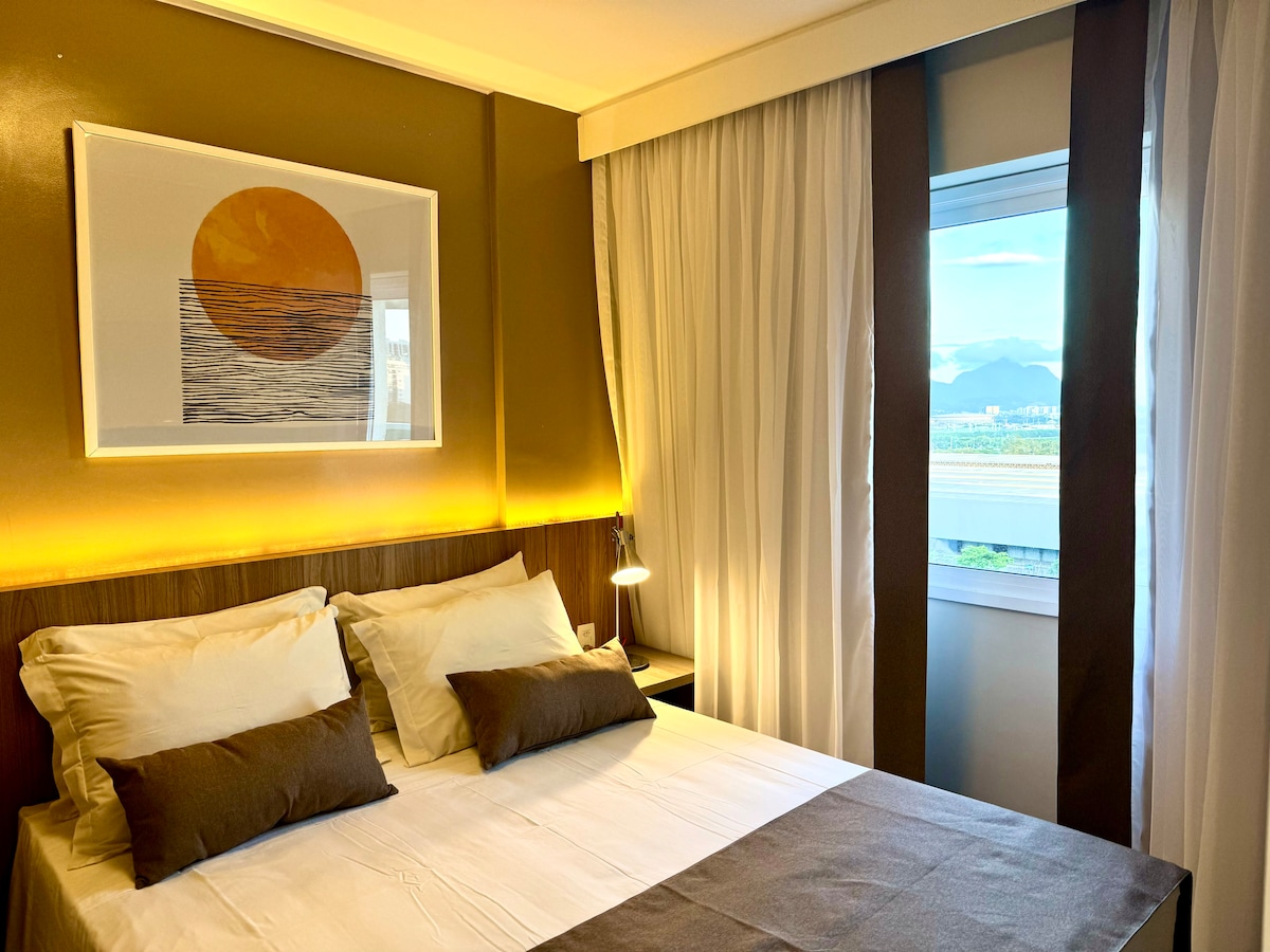 Suite for dine forretnings- eller fritidsbehov, på det strategiske punktet i Barra Olímpica nær Rio Centro, Parque Olímpico, Farmasi Arena. 15 minutter fra Recreio-stranden. Suite med minibar, klimaanlegg, hårføner, kingsize-seng av høy standard, i beste standard for de beste hotellene. Internett tilgjengelig (350M) og 65" smart-TV Den beste utsikten over Barra, med en fuglesymfoni ved daggry. Det er stedet du ønsker for deg selv. Barra da Tijuca og Recreio dos Bandeirantes