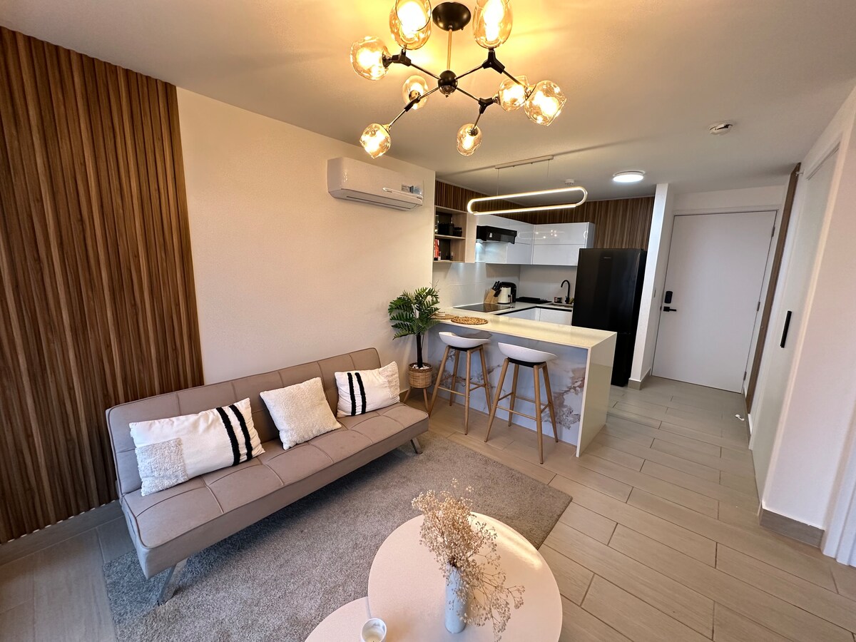 Moderne og stilig leilighet med åpen planløsning og alle hjemmets bekvemmeligheter. Sengeplass til opptil fire med en queensize-seng på soverommet og en sovesofa i stuen. Nyt et fullt utstyrt kjøkken, raskt trådløst nettverk og klimaanlegg. Beliggenhet i hjertet av byen, bare noen skritt fra bankdistriktet og Via España, og i nærheten av Soho Mall, Multiplaza Mall, restauranter, kaféer, apoteker og T-banen. Perfekt for forretningsreisende eller fritidsreisende som ønsker bekvemmelighet, komfort og en ekte byopplevelse.