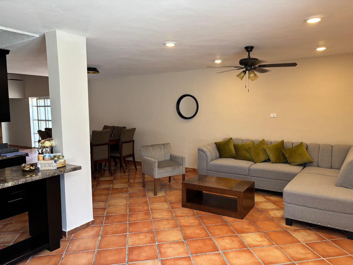 Vakkert hus med tre klimatiserte soverom med kingsize-senger og komplett bad i hvert rom. Overbygd parkering med port for to kjøretøy, palapa, overbygd terrasse, grill, bord, stoler, hagesalong, lite basseng og hage. Kjøkkenet er utstyrt med komfyr, ovn, mikrobølgeovn, kjøleskap, servise, bestikk, glass og kopper, en spisestue og en koselig stue for å nyte en 60" TV med internettforbindelse og Netflix-tjeneste. Alle områder med takvifte