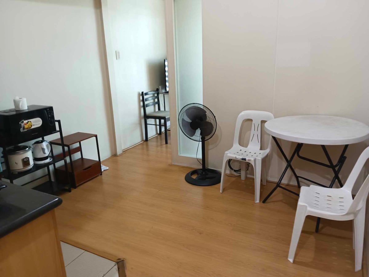 A classy minimalist nordic inspired 33sqm fully furnished unit. Room Inclusions: 📺 55 inch Smart TV with Netflix and Cable 🛜 Free Wifi connection 🌬️ Air conditioned room 🛏️ 1 Double Size Bed 🛌1 Extra Single size bed 🛋️ 1 Sofa 🪑4 Seater Dining Table 🍽️ Fully equipped kitchen with full size refrigerator, microwave, rice cooker, stove, exhaust fan, cooking equipments and kitchen utensils 🚻 Bathroom with water heater, toilet and bidet