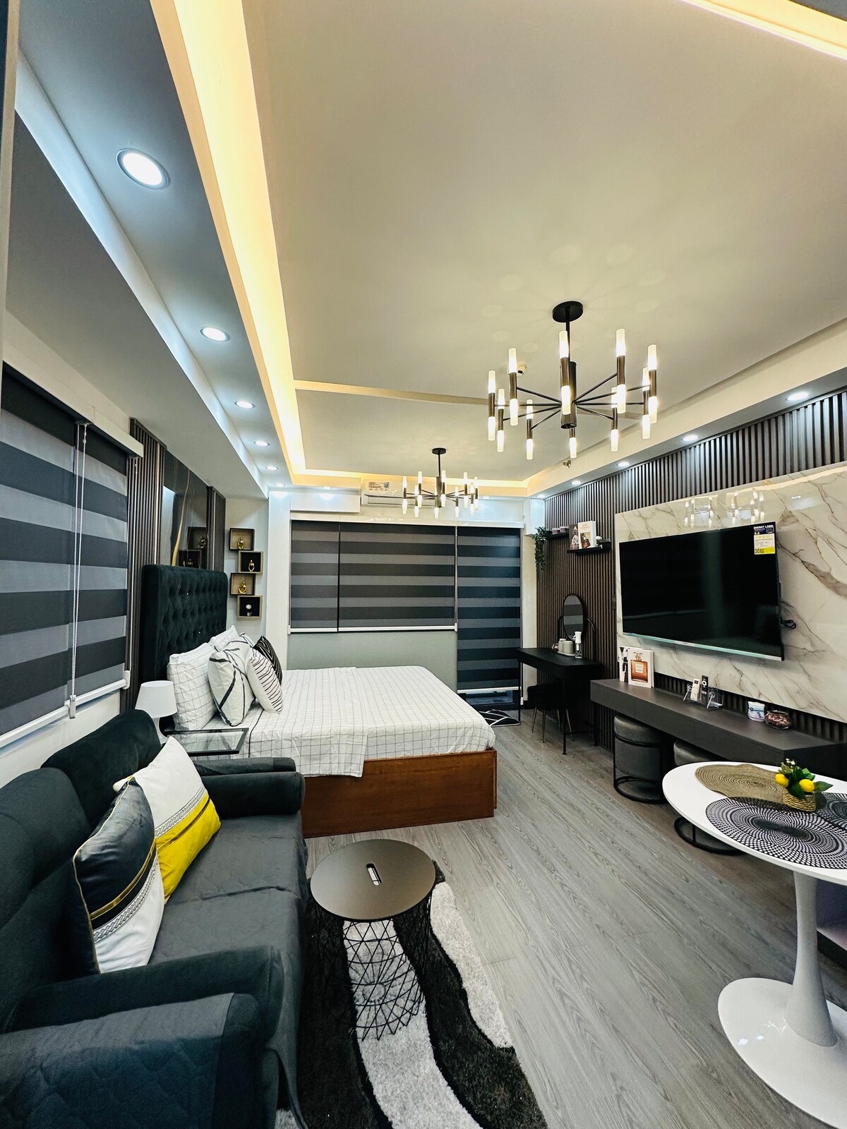 Velkommen til CIRQ Studio på Eton Emerald Lofts. Denne splitter nye 40 kvm loftsleiligheten ligger i hjertet av Ortigas forretningsdistrikt og ligger bare fire minutters gange til Robinsons Galleria. Hovedtemaet og inspirasjonen til denne leiligheten er Japandi Modern hotell-luksus-stil med moderne møbler og dekorasjoner fra midten av århundret. Nøytrale toner med en kombinasjon av mørke treteksturer med aksenter av titanblå og gullfarger gjør hvert hjørne av leiligheten Instagram-vennlig. :)