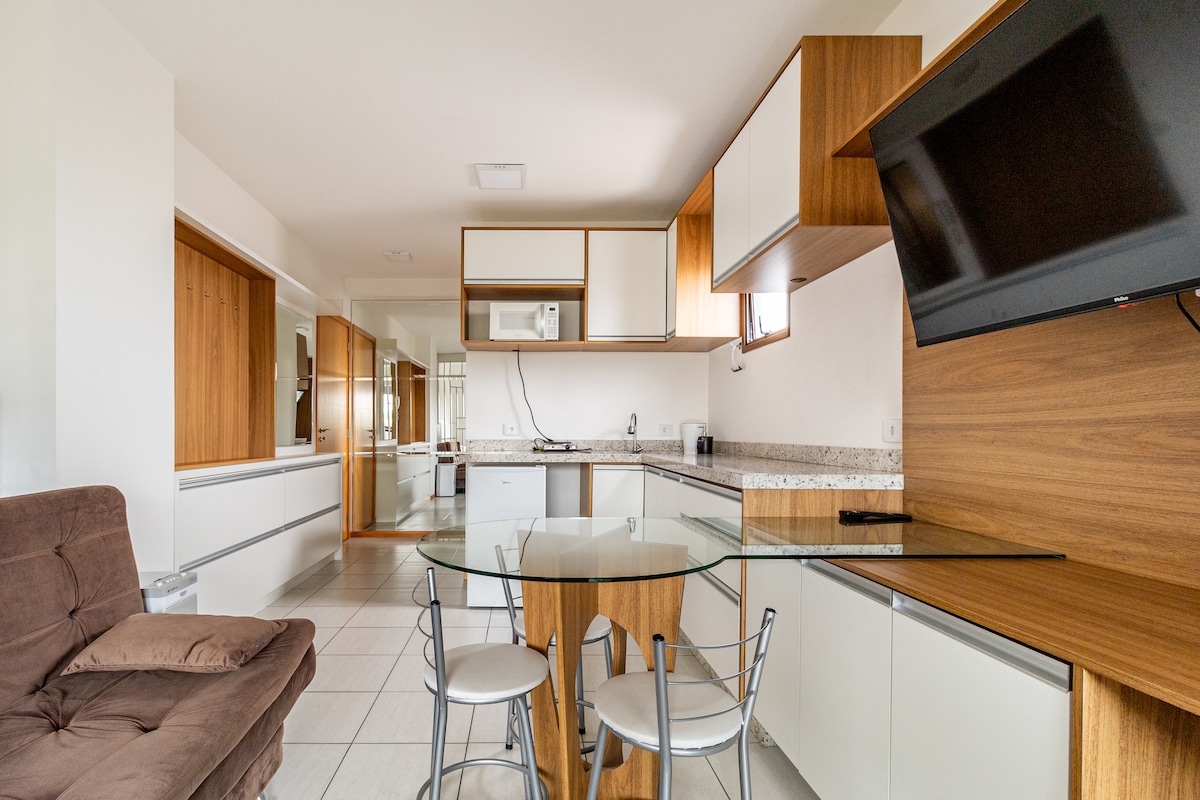 Studio svært godt dekorert og superutstyrt i høy etasje. Ideell for profesjonelle som kommer til Curitiba for forretninger og par som setter pris på god smak, en vakker utsikt over byen og bekvemmeligheten av å være i nærheten av alt. Garasjen må bestilles og daglig betaling kl. 25.00.