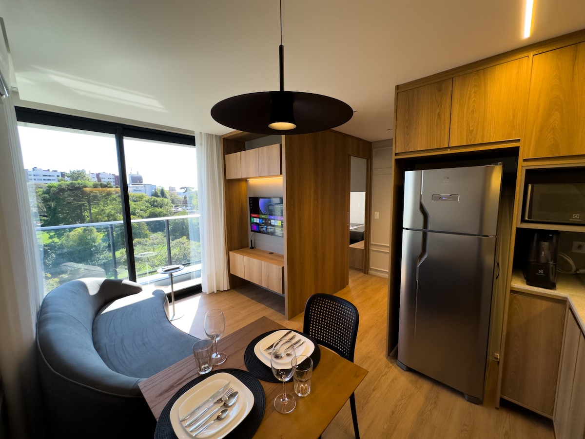 Oppdag raffinement i denne moderne, solfylte studioleiligheten i hjertet av Batel, Curitibas mest eksklusive nabolag. Perfekt designet for opptil fire gjester, med en dobbeltseng og en sovesofa. Nyt eksklusiv tilgang til basseng, badstue og treningssenter. Du er bare noen skritt unna Shopping Pátio Batel, de beste restaurantene og barene. En perfekt blanding av komfort, stil og beliggenhet.