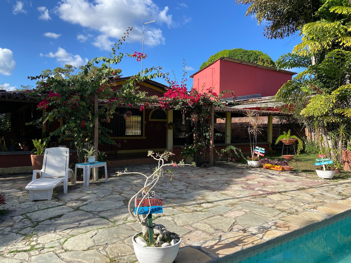 Leve toda a família a este ótimo lugar com muito espaço para se divertir. Casa de campo com piscina e amplo jardim. Perfeito para descansar, curtir a natureza, lazer, confraternizações e casamentos. Com espaço para churrasco, futebol, rede e harmonia com a natureza. Clima agradável com som de animais domésticos e nativos. Perto (3 km) de restaurantes, shopping, supermercados, padaria, entre outras diversões de Aldeia.