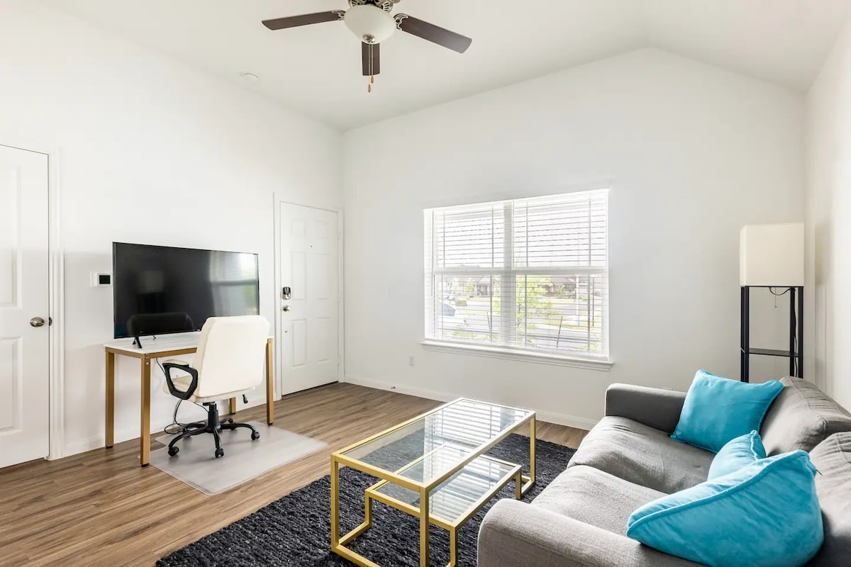 En halv miles gange til Main St.! Bluebonnet Hideaway Suite er veldig komfortabel og avsidesliggende. Suiten er et nyoppusset, romslig soverom med hvelvet tak, rustikke takbjelker og mye naturlig lys. Det oppdaterte badet har en stor glassdusj og garderobeskap. Den velutstyrte kaffebaren har minikjøleskap, Keurig-kaffemaskin og mikrobølgeovn. Ute er det en privat terrasse med boblebad. Parkering på stedet. Suiten er helt privat, med egen privat inngang.