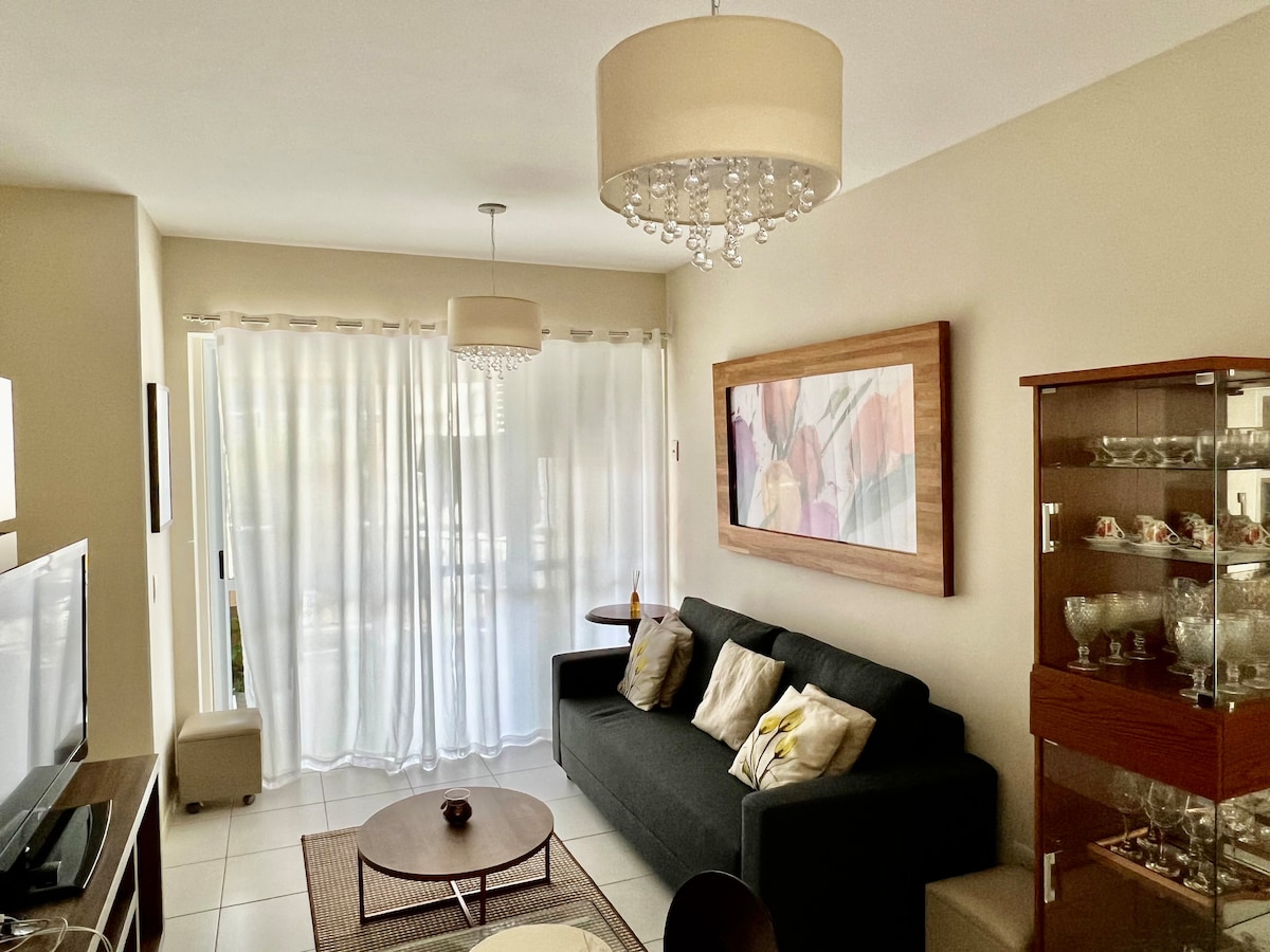 Bli fortryllet av denne leiligheten med ett soverom og to bad i Barra da Tijuca. Plass til 3 komfortabelt, pluss 1 på sovesofaen. Utstyrt med automatisering med talekontroll (Alexa), trådløst nettverk, 65tommers TV med 5.1.2-lyd, komplett kjøkken, trousseau for fire personer og gratis parkering. Nyt et oppvarmet basseng, boblebad, badstu, treningsstudio med mer. Ideell beliggenhet nær stranden og flotte barer og restauranter. Opplev det beste av Barra på et luksuriøst og koselig sted.