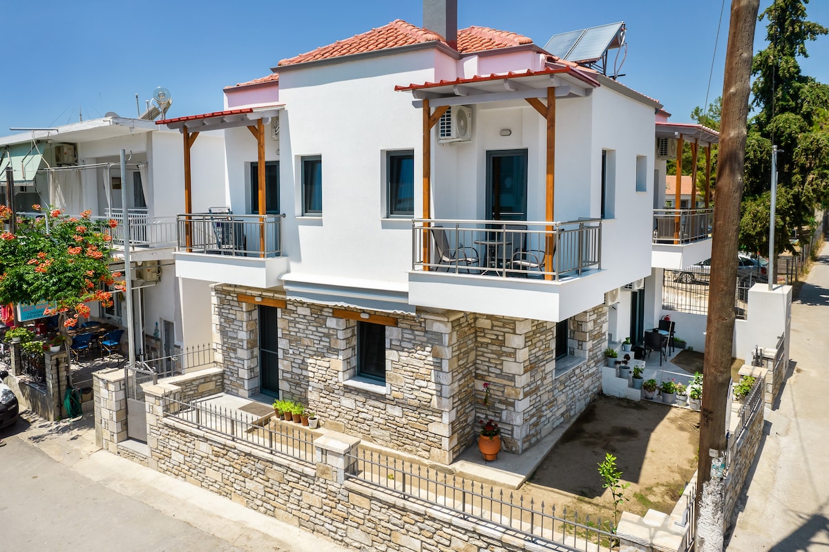 Leilighet i et veldig rolig nabolag i landsbyen Limenaria, bare 6–8 minutter til fots fra havet, restauranter og barer. Det ligger et supermarked og bakeri innenfor 150 meter. Tilgjengelig tre private balkonger. Foran huset er det en offentlig parkeringsplass.