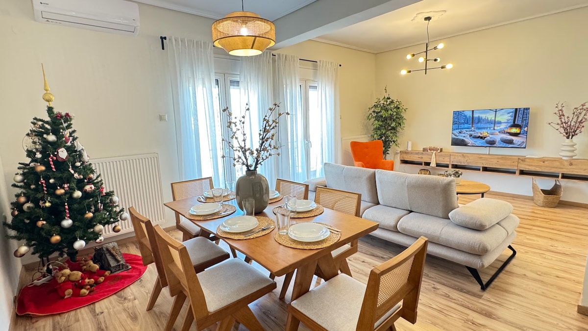 Denne stilige og solfylte leiligheten på 100 kvm ligger i gamlebyen i Kalampaka. Den ligger i et vakkert landskap omgitt av trær med en fantastisk terrasseutsikt over de berømte Meteora-klippene!Ved å bo her har du god tilgang til Kalampakas shoppingområde (restauranter, bakerier, kaffebarer, banker, postkontor osv.), da det ligger bare fem minutter fra sentrum. Den ligger i et rolig nabolag som er praktisk for å nå de beste stedene i Kalampaka, og du kan til og med utforske Meteora til fots! Den sentrale beliggenheten, den profesjonelle rengjøringen og den elegante innredningen gjør den egnet for alle gjester.