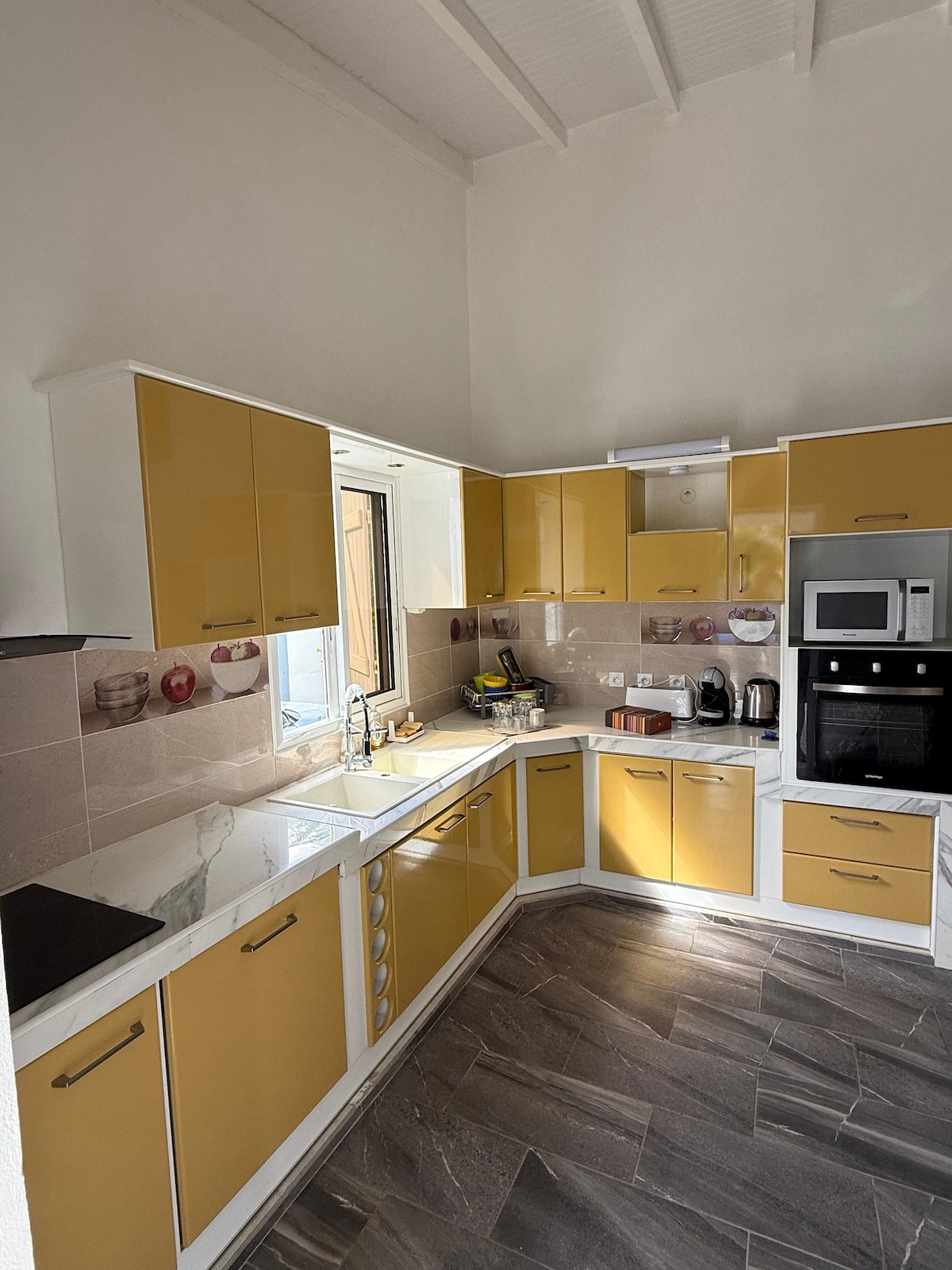 Fargerikt og lyst hus, perfekt for et eksotisk opphold. Dynamisk, lysegul stue/spisestue med åpent utstyrt kjøkken (kjøleskap, stekeovn, mikrobølgeovn, komfyr, oppvask). Sovesofa + TV. To soverom med klimaanlegg: et grønt med komfortabel dobbeltseng, et blått, oppbevaring og mørkleggingsgardiner. Moderne bad: dusj, toalett, vaskemaskin. Stor, overbygd terrasse med grill og sitteplass ute. Trådløst nettverk, klimaanlegg. Nær strender (5–10 minutter med bil).