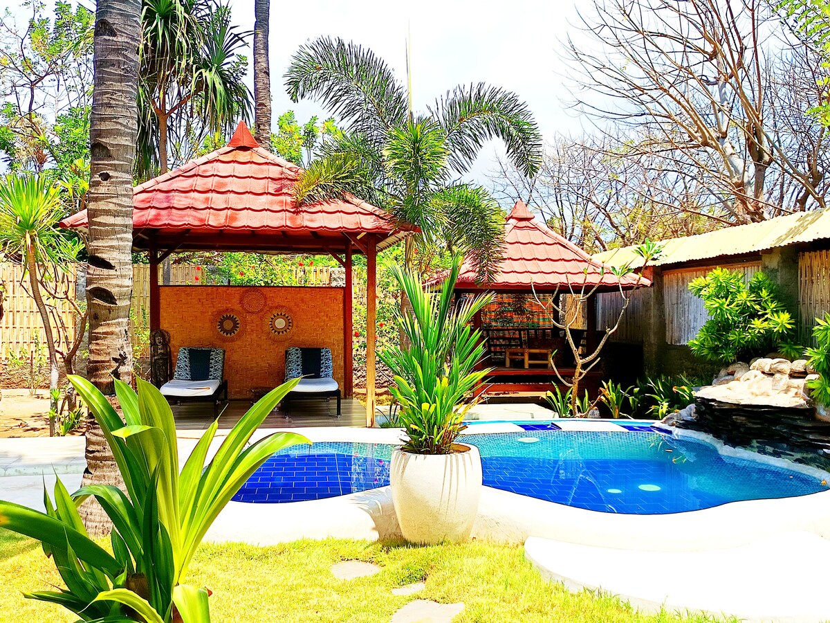 Dette huset i tradisjonell stil er laget hovedsakelig av bambus, og tilbyr en autentisk opplevelse på øya Gili Meno. Bambus er det tradisjonelle byggematerialet i Lombok og er det mest miljømessig bærekraftige av byggematerialer. Bambusbygninger puster så huset forblir naturlig kjølig. Den er også bygget for komfort, og ligger i en vakker hage, med privat kjøkken, stue og bad, og drar nytte av en soloppvarmet varmtvannsdusj, et solcellebasert backup-system og gratis trådløst nettverk.