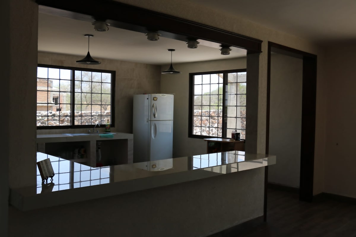 Vakkert og komfortabelt hus i meksikansk stil. For åtte personer, som ligger ti minutter med bil fra Tequis sentrum, 30 minutter fra Peña de Bernal og 20 minutter fra ulike vingårder. Oppvarmet 7x4 basseng med privat solsystem kun for deg. Grill, bålplass, peis (inkluderer ikke ved eller kull), fontene, jacuzzi, utstyrt kjøkken, trådløst nettverk, 50 tommers 4K smart-TV og kabel-TV, NETFLIX, YouTube. Vi aksepterer to mellomstore kjæledyr mot et gebyr på 300 USD (registrer dem i APPEN).