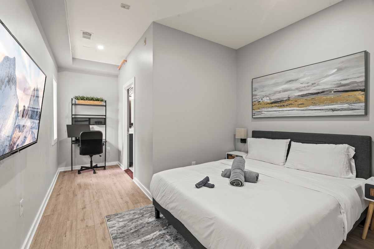 Dette moderne loftet har 1 kingsize-seng, 1 soverom, 1,5 bad, en 55" TV i stuen og 50" TV på soverommet med vaskemaskin og tørketrommel. Denne stilige leiligheten ligger bare tre minutters kjøretur fra konferansesenteret, Chinatown, Reading Terminal Market, kjøpesentre, barer, restauranter og lounger. Den er det perfekte tilfluktsstedet etter en dag med utforskning av Philadelphias beste attraksjoner.