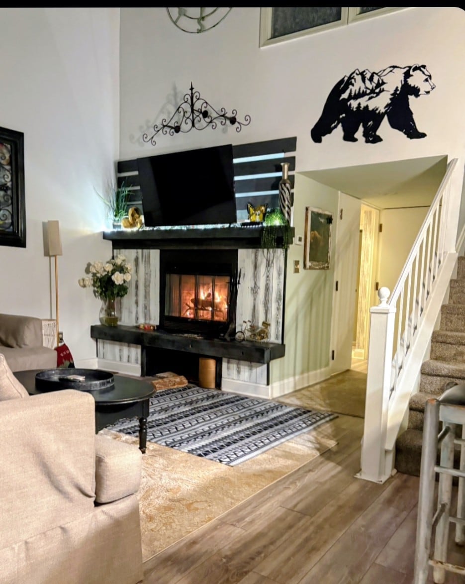Moderne Pocono-oase med peisstemning